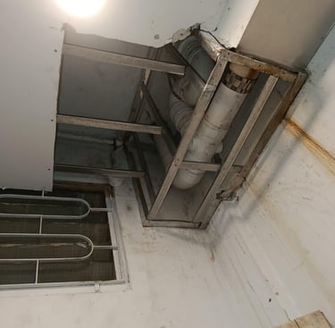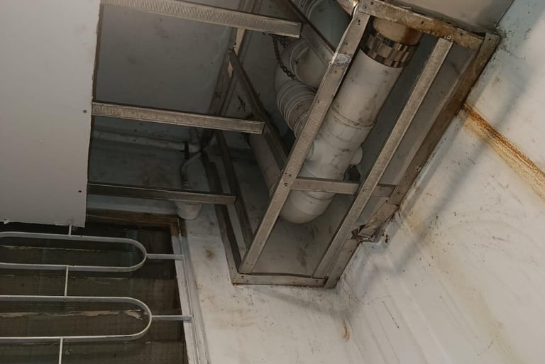 The ceiling was left open after the pipe installation, exposing the drainage system and leaving the area unfinished